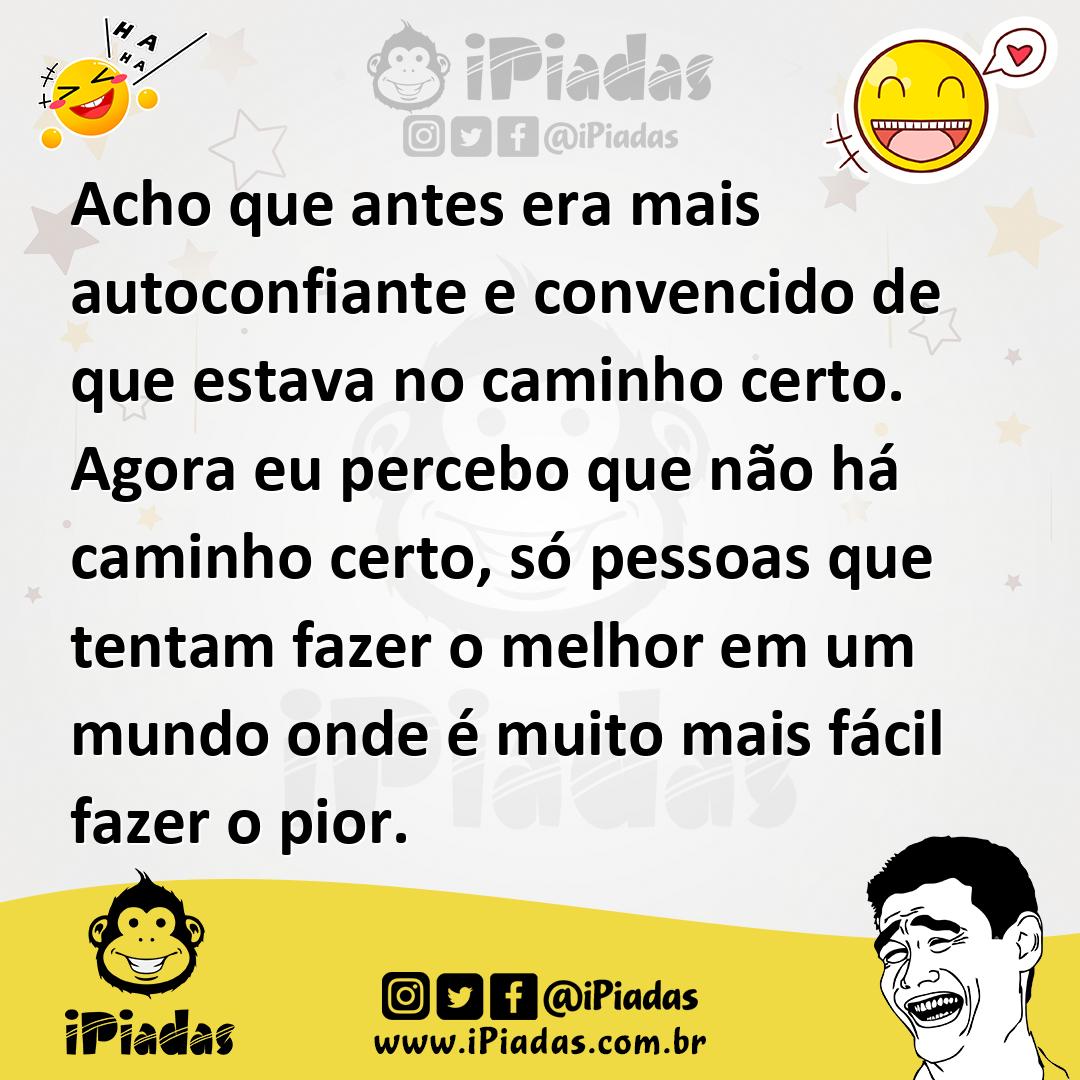 Acho que antes era mais autoconfiante e convencido de que estava no caminho certo. Agora eu percebo que não há caminho certo, só pessoas que tentam fazer o melhor em um mundo onde é muito mais fácil fazer o pior. Compartilhe